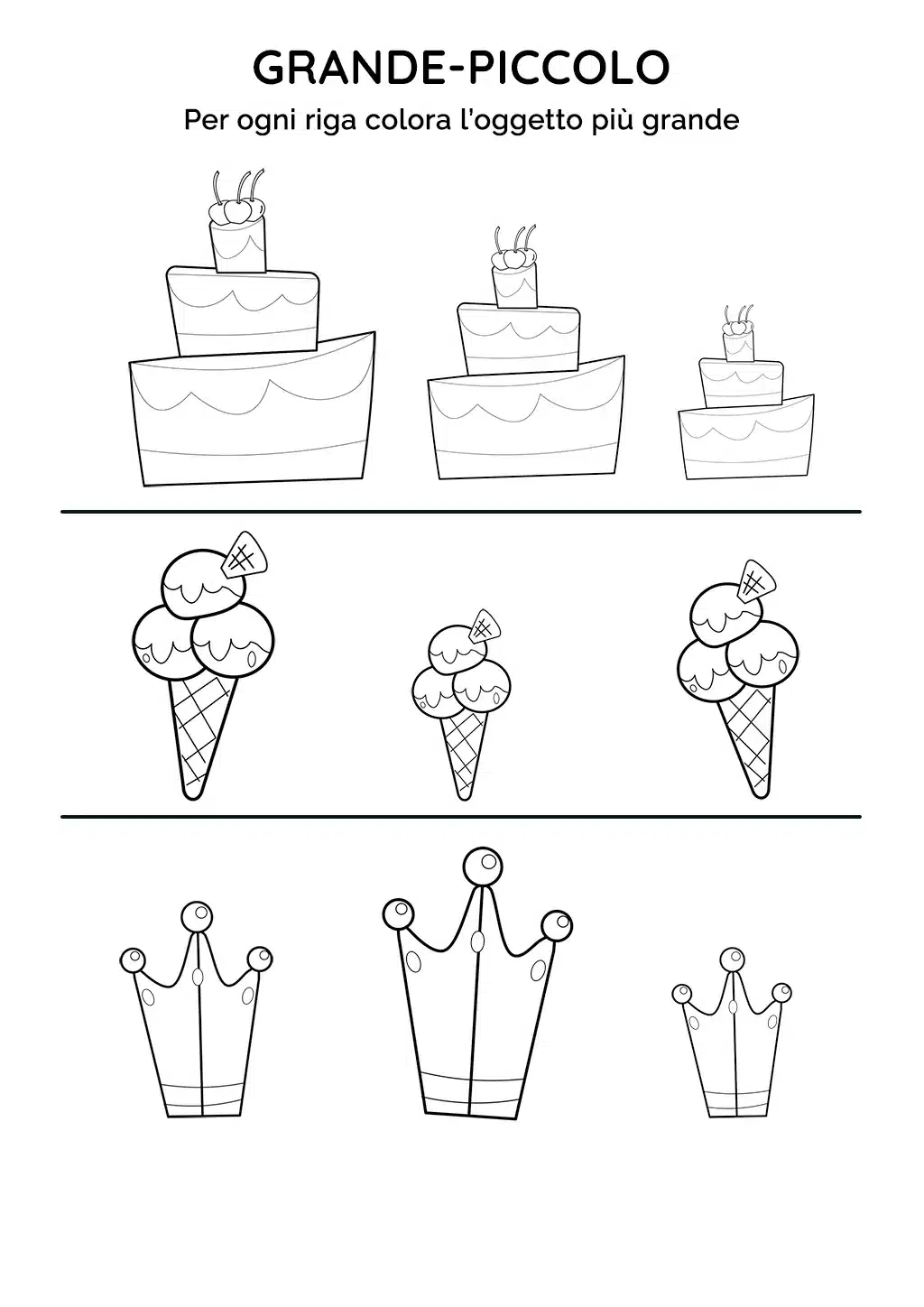 All'interno della scheda, ci sono immagini di tre torte, tre coni gelato e tre corone, tutti di dimensioni diverse. Ogni elemento offre ai bambini l'opportunità di osservare e confrontare le diverse dimensioni in modo piacevole e interattivo.