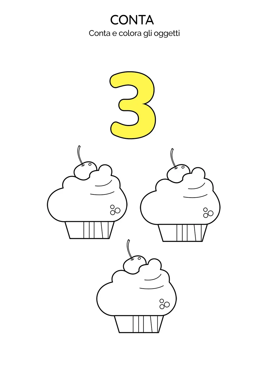 Nella scheda troverai tre deliziosi cupcake e il numero 3. Il tuo compito è contare e colorare tutti i cupcake!