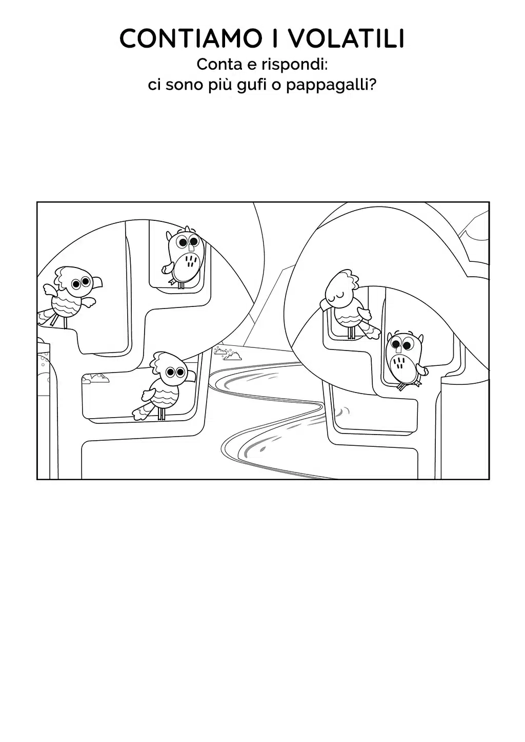 Un divertente gioco di conteggio: trova se ci sono piรน gufi o pappagalli nella nostra scheda didattica!