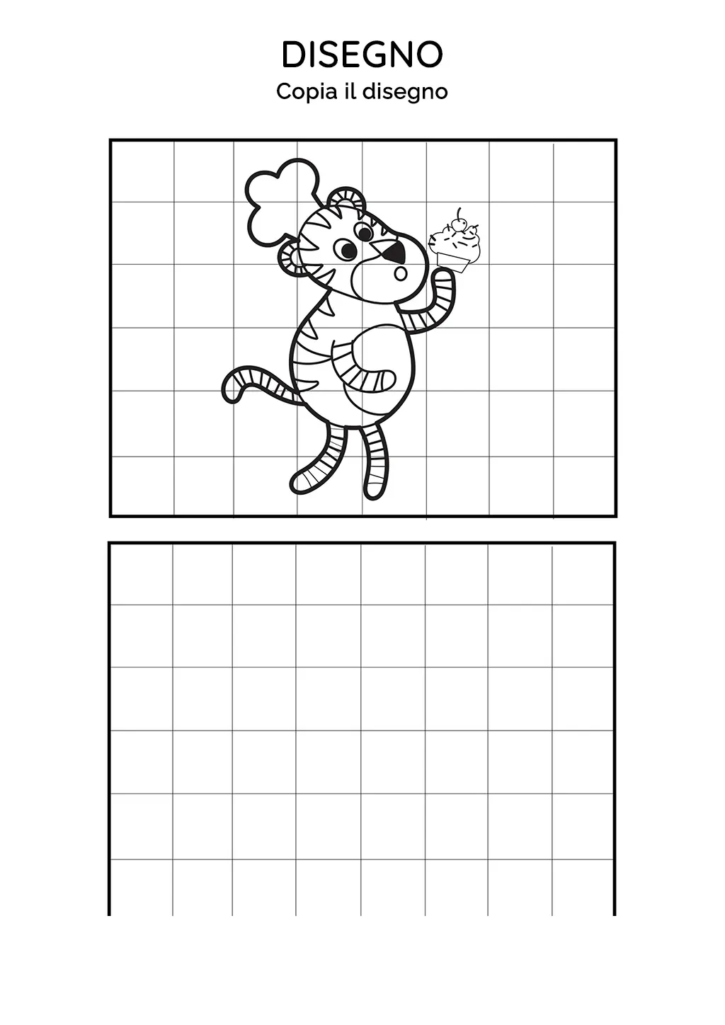 Il protagonista di questa scheda didattica è Marie la tigre, che indossa un cappello da pasticcere e tiene in mano un cupcake delizioso. I bambini avranno l'opportunità di imparare a copiare con precisione il suo disegno, stimolando la loro creatività e migliorando le loro abilità artistiche.