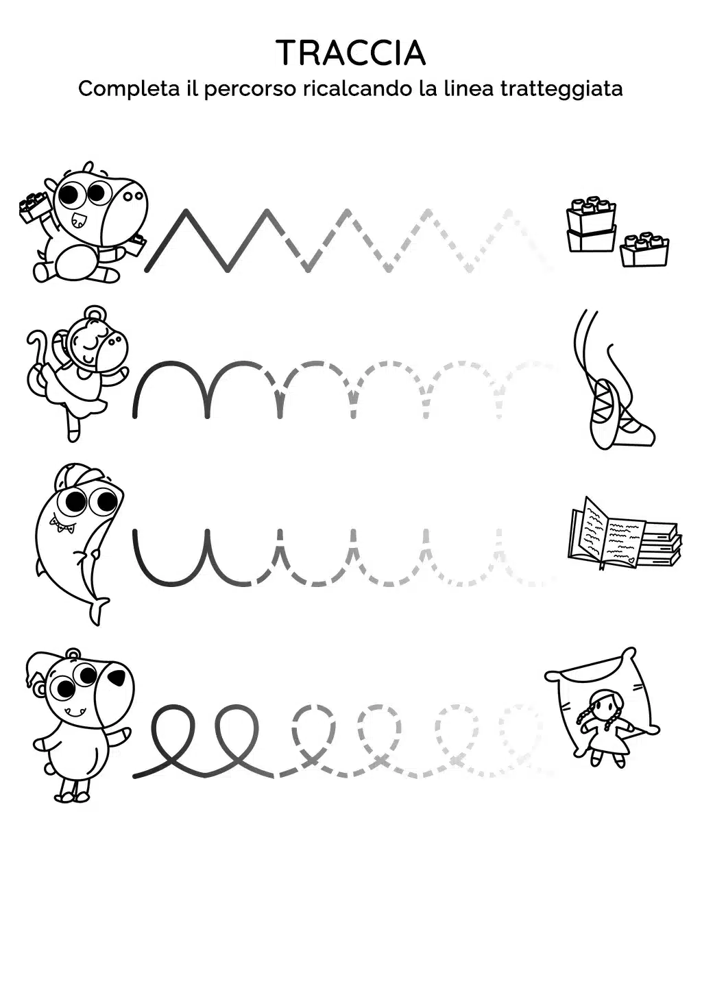 La scheda didattica presenta quattro percorsi con linee tratteggiate. Ogni percorso ha un personaggio all'inizio (un ippopotamo, una scimmia, uno squalo, un orsetto) e un oggetto alla fine (costruzioni, scarpette da danza, libri, un peluche). Il compito del bambino รจ di disegnare la linea tratteggiata per aiutare ogni personaggio a raggiungere il suo oggetto.