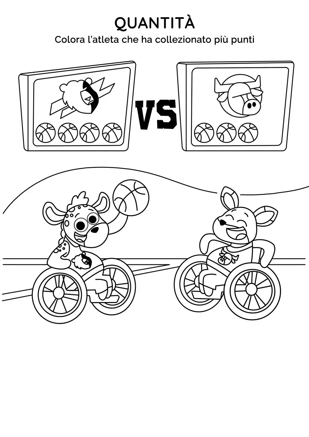 All'interno della scheda, c'è un tabellone da basket che segna i punti. La squadra con lo stemma del leone ha 4 punti, mentre la squadra con lo stemma del toro ne ha solo tre. I bambini saranno sfidati a contare i punti di ogni squadra e a confrontare le quantità.