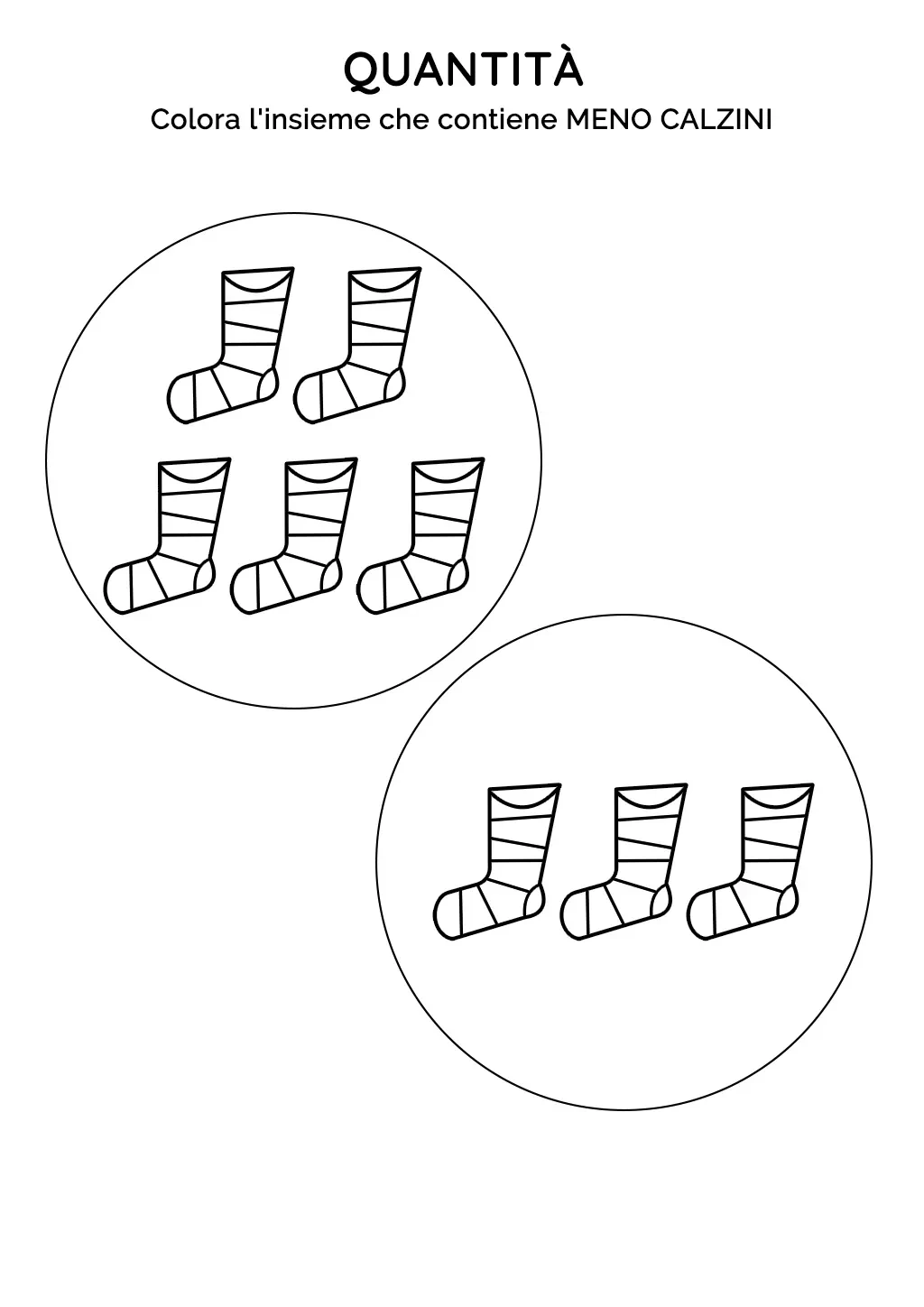 All'interno della scheda, ci sono due cerchi: nel primo cerchio sono presenti cinque calzini, mentre nel secondo cerchio ce ne sono solo tre. I bambini saranno sfidati a contare i calzini in ogni cerchio e a confrontare le quantità.