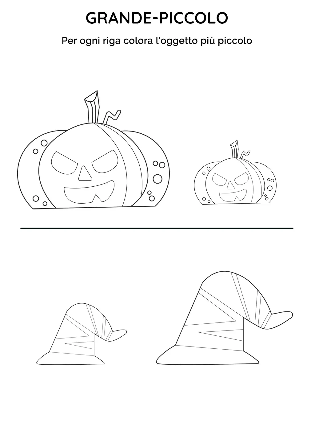 La notte più spaventosa dell'anno diventa un'occasione di apprendimento! Questa scheda didattica propone un gioco di confronto dimensionale attraverso l'osservazione di zucche di Halloween intagliate e cappelli da strega. Ogni elemento viene presentato in due diverse dimensioni, stimolando la curiosità dei piccoli e introducendo il concetto di "grande" e "piccolo" in maniera divertente.