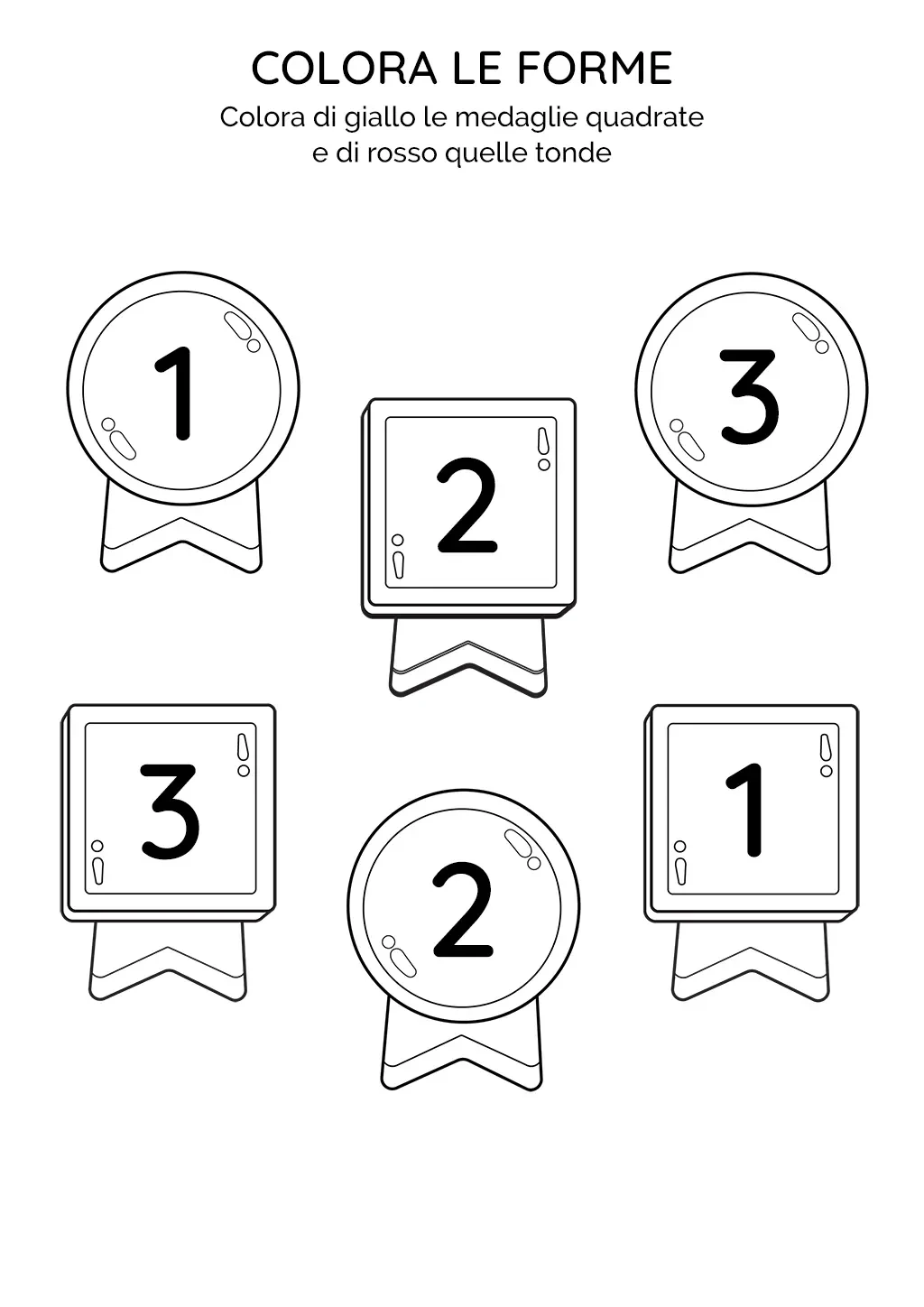 All'interno della scheda, ci sono tre medaglie tonde e 3 medaglie quadrate. I bambini saranno sfidati a riconoscere la forma di ciascuna medaglia e a contarle correttamente.