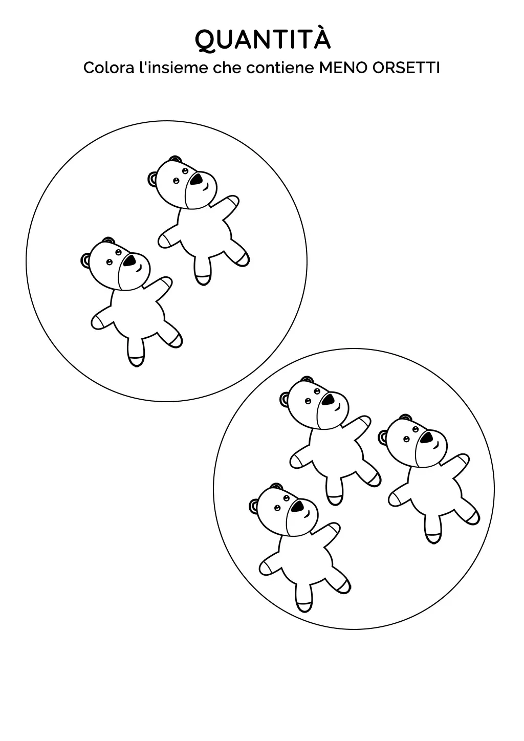 In questa scheda didattica, i bambini sono invitati a contare e confrontare le quantità di orsetti di peluche presenti in due cerchi. Un'attività divertente per sviluppare le abilità di conteggio e confronto delle quantità.