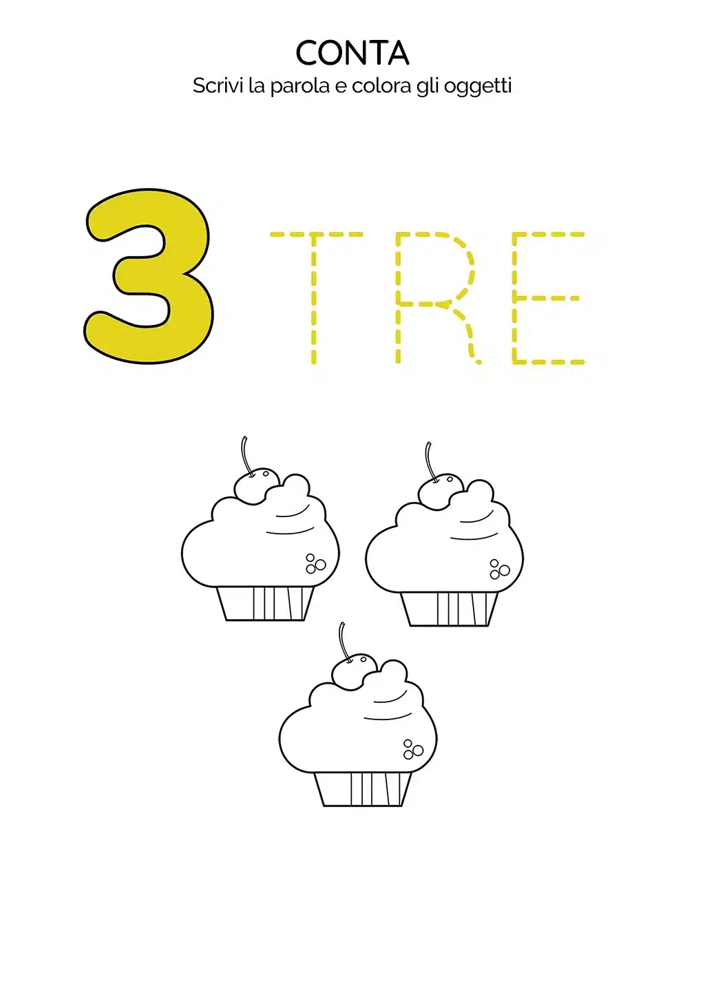 Nell'immagine della scheda, troveranno il numero 3, la scritta "TRE" da scrivere tratteggiata e tre cupcake da colorare.
