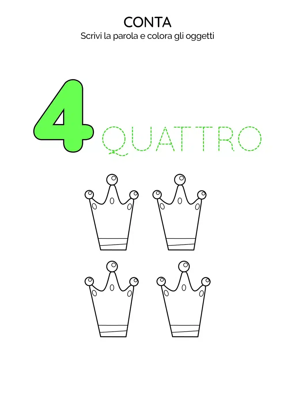 Nell'immagine della scheda, troveranno il numero 4, la scritta "QUATTRO" da scrivere tratteggiata e quattro corone da colorare.