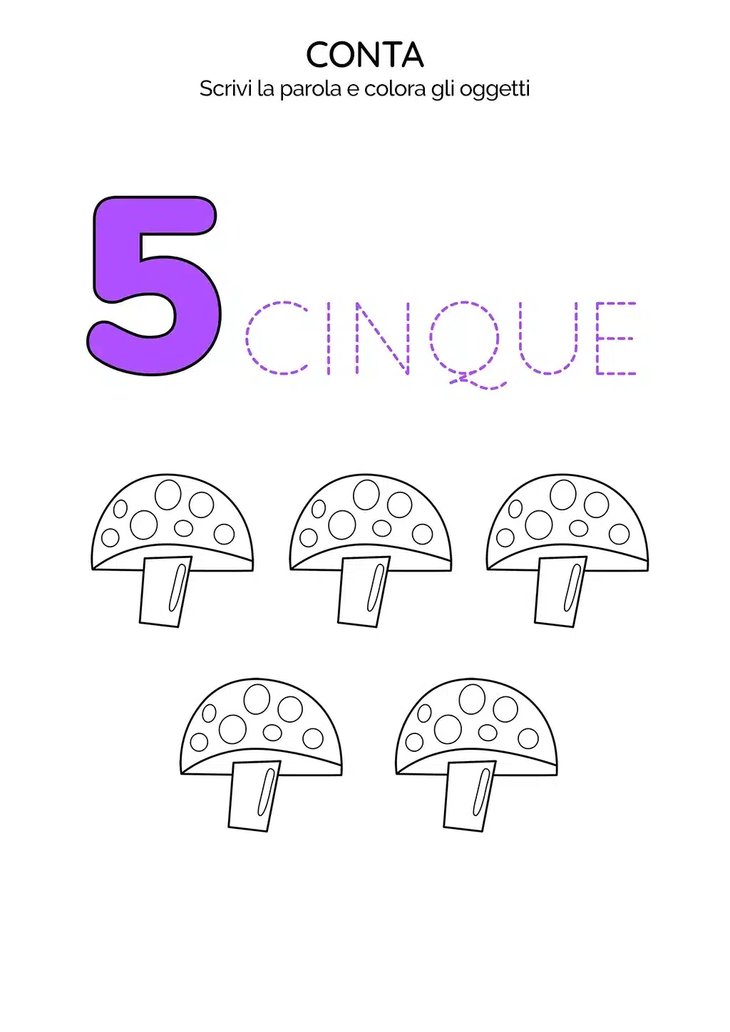 Nell'immagine della scheda, troveranno il numero 5, la scritta "CINQUE" da scrivere tratteggiata e cinque funghi da colorare.
