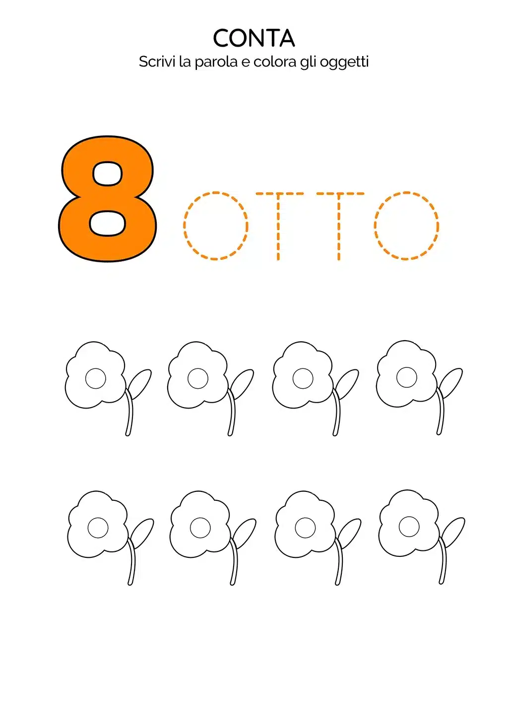Nell'immagine della scheda, troveranno il numero 8, la scritta "OTTO" da scrivere tratteggiata e otto fiori da colorare.