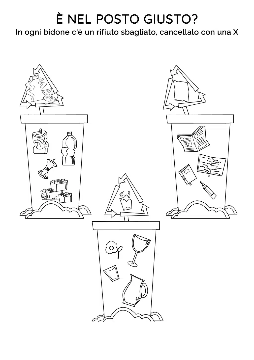 Questa scheda didattica propone un gioco: trovare il rifiuto sbagliato in ogni bidone della raccolta differenziata e cancellarlo con una X. Un'attività ludica ed educativa per imparare l'importanza del riciclo.