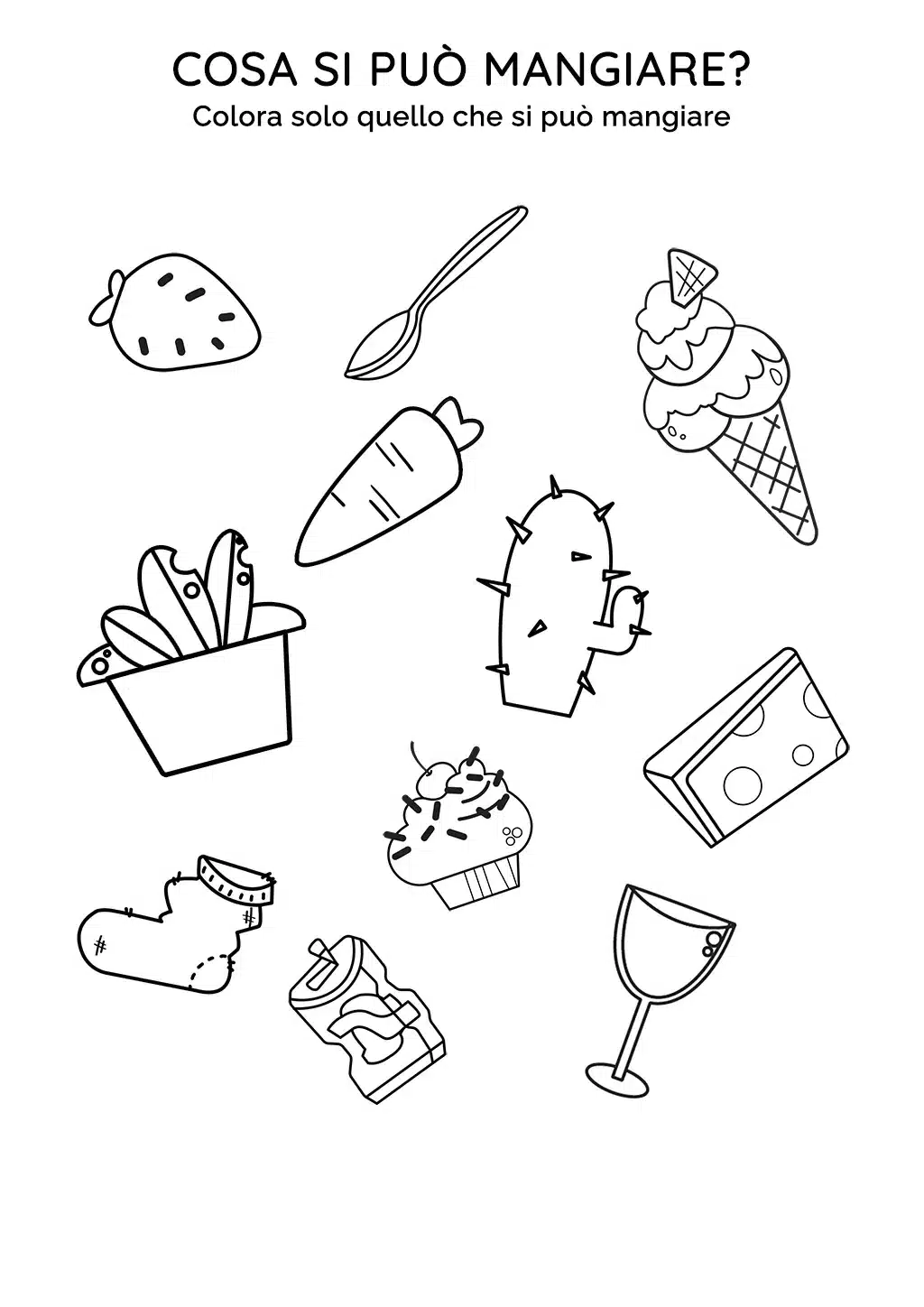 In questa scheda didattica, i bambini incontreranno una serie di immagini di oggetti e alimenti. Ci sono una fragola, un cucchiaio, un cono gelato, una carota, ma anche un cactus, un vaso, un vecchio calzino, una lattina schiacciata, un cupcake, un bicchiere di vino e un pezzo di formaggio. L'attività consiste nel riconoscere e categorizzare gli elementi in base al loro uso: quali sono alimenti e quali no?