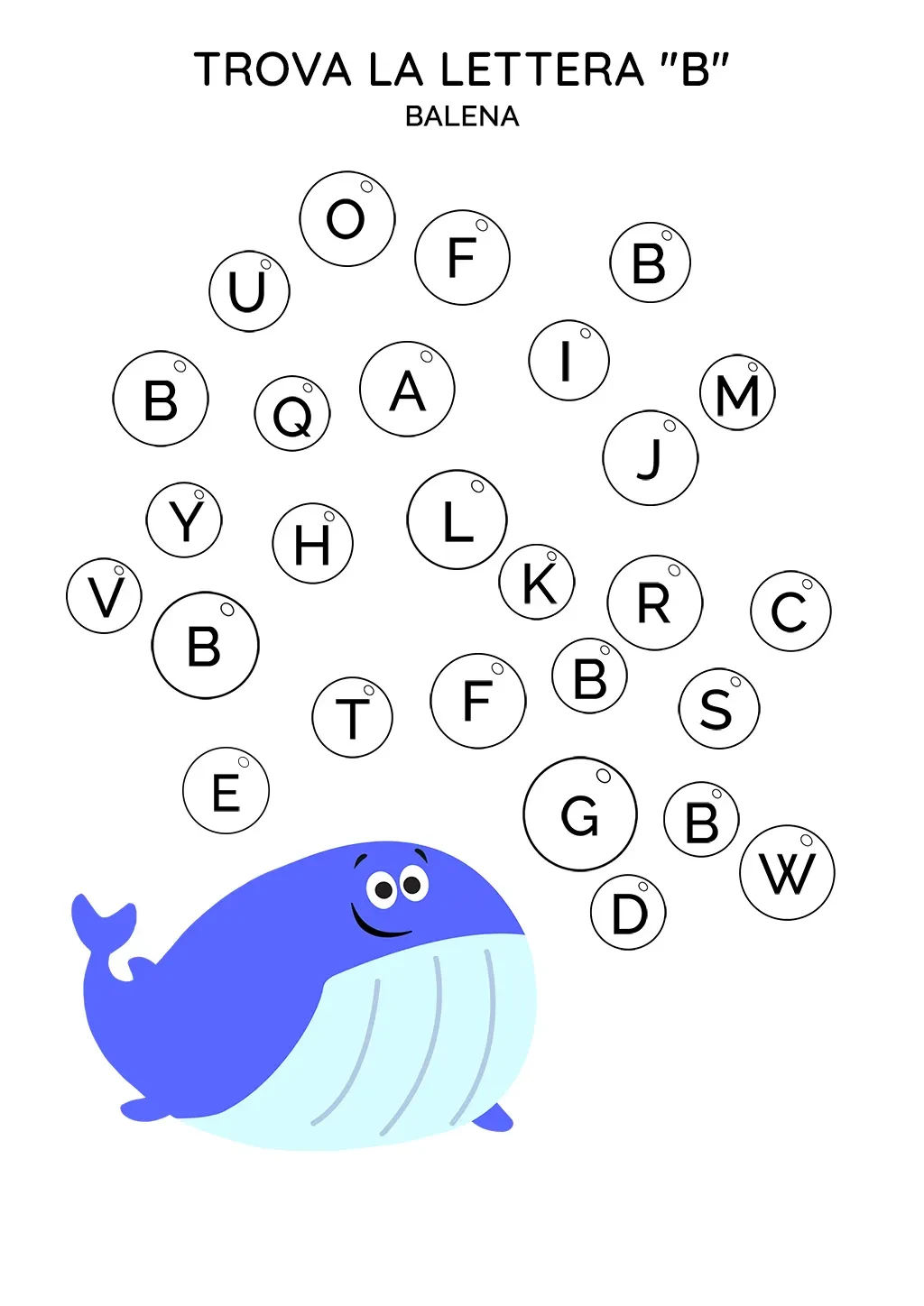 La scheda contiene diverse lettere 'B' nascoste in varie parti del foglio. Il compito dei bambini sarà quello di trovare tutte le 'B' e, per rendere l'attività ancora più divertente, potranno colorare l'immagine della balena, l'animale che inizia con la stessa lettera.
