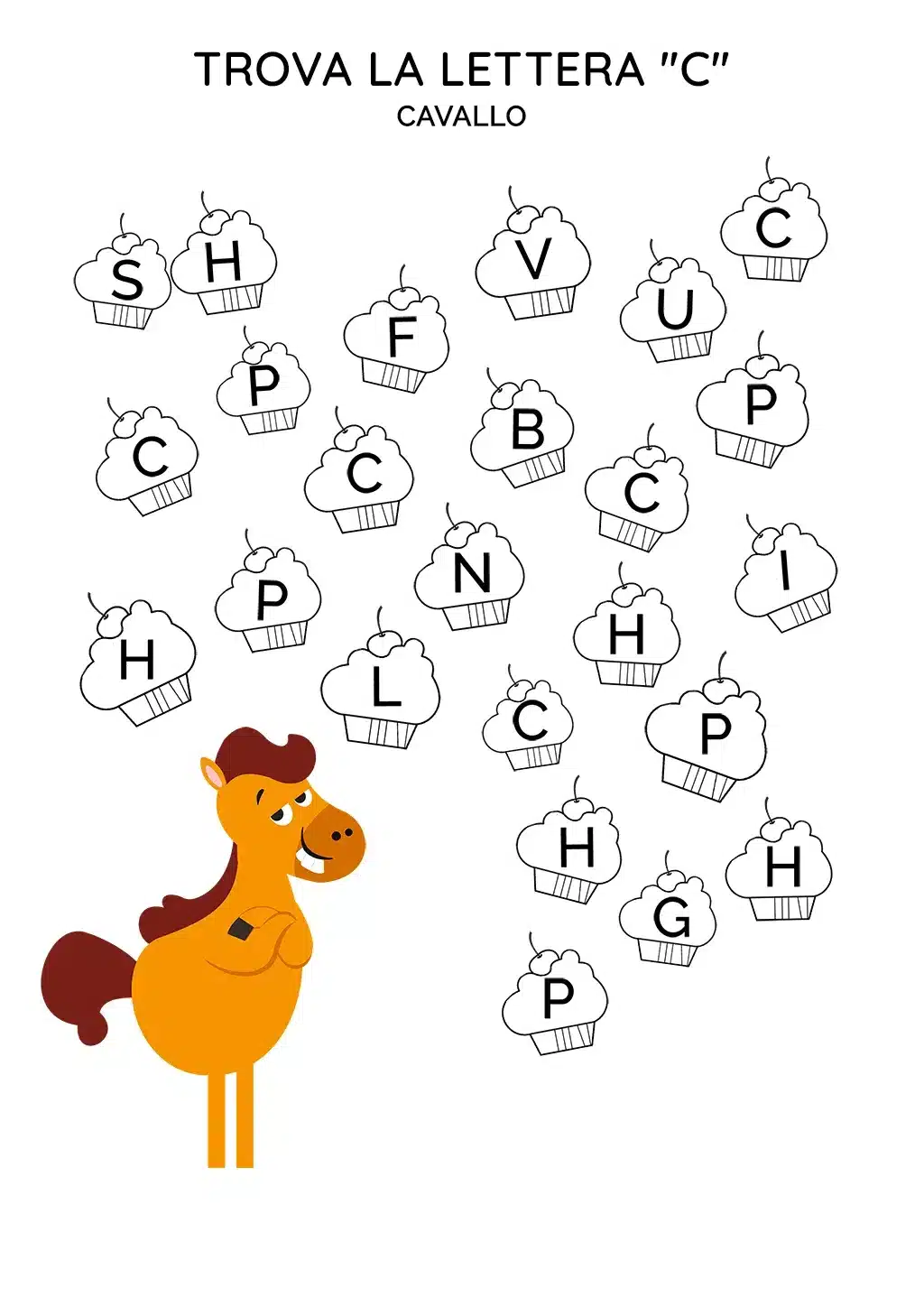 La scheda presenta diverse lettere 'C' disseminate in varie parti del foglio. I bambini dovranno trovare tutte le 'C' e, per rendere l'attività più coinvolgente, potranno anche colorare l'immagine del cavallo, l'animale che inizia con la stessa lettera.