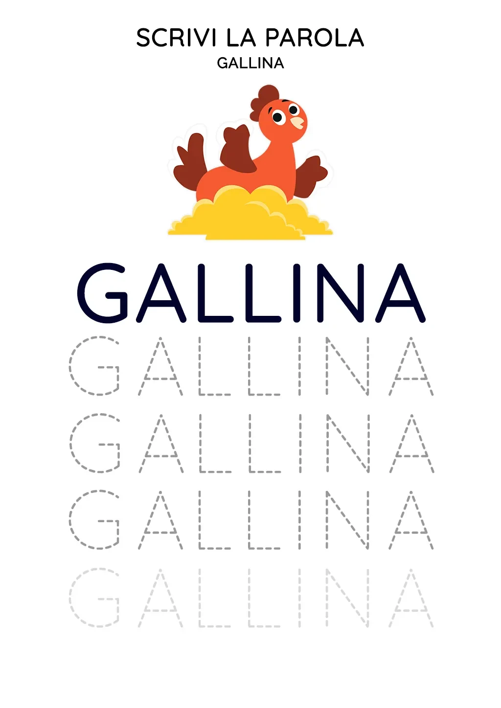 Questa scheda didattica invita i bambini a migliorare le loro abilità di scrittura, scrivendo la parola 'Gallina'. L'obiettivo è di rafforzare la connessione tra le parole e i loro significati, contribuendo allo sviluppo delle competenze linguistiche e di scrittura dei bambini.