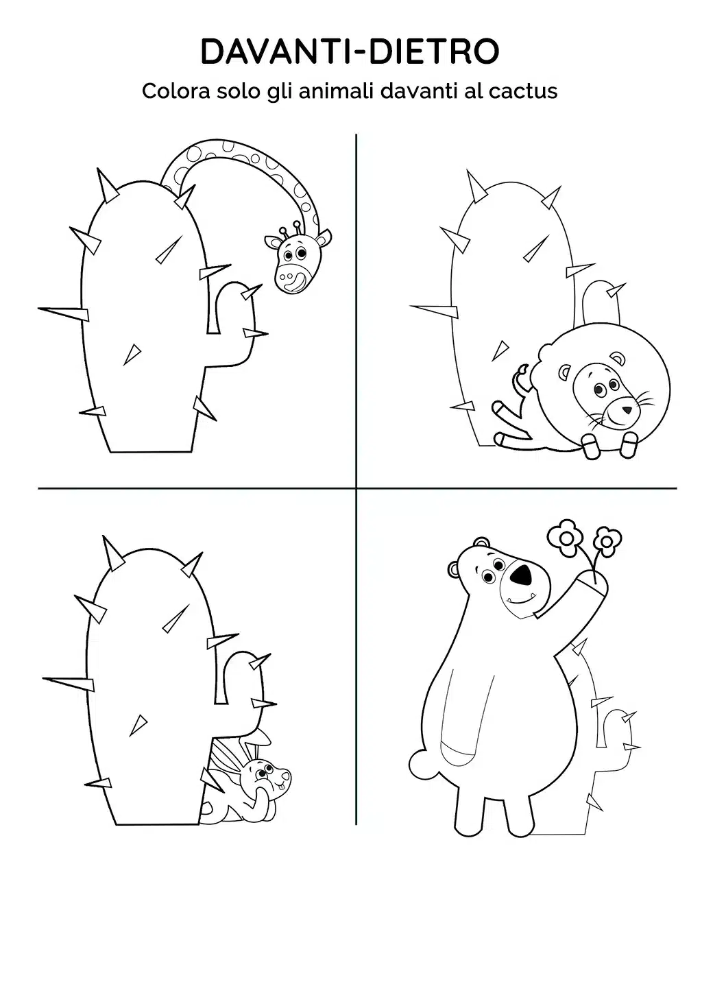 Questa scheda didattica aiuterร i bambini a comprendere i concetti spaziali di "davanti" e "dietro". La missione รจ colorare solo gli animali che sono posizionati davanti al cactus.