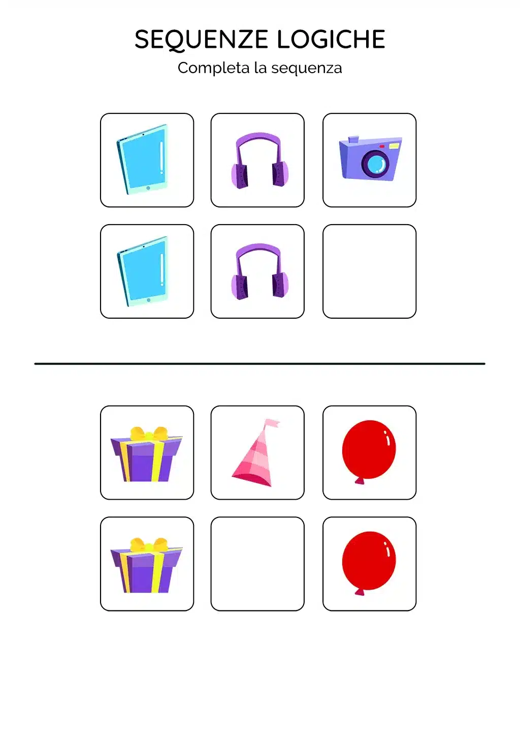 La scheda propone divertenti griglie 3x2 con tablet, cuffie, fotocamera, pacchi regalo, cappellini e palloncini. I bambini dovranno completare le sequenze.