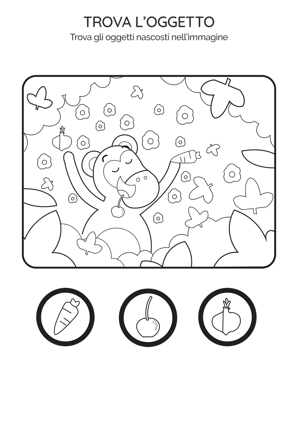 Nell'immagine, Vickey la Scimmia è immersa nella natura. I bambini dovranno cercare e identificare una carota, una ciliegia e una cipolla nascoste nell'immagine.