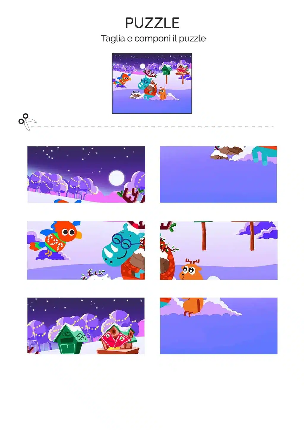 La scheda didattica presenta l'immagine di un puzzle giร composto e sotto di essa, i pezzi del puzzle da ritagliare. Il compito dei bambini รจ ricomporre l'immagine utilizzando i pezzi forniti.