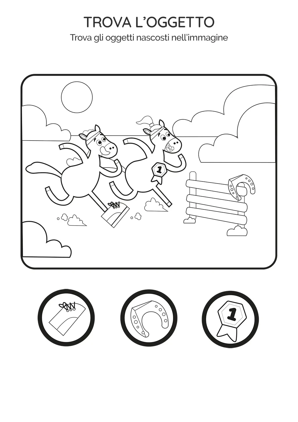 Nell'immagine, ci sono due cavalli che stanno correndo e stanno per saltare una staccionata. I bambini dovranno cercare e identificare una scarpa, un ferro di cavallo e una coccarda nascosti nell'immagine.