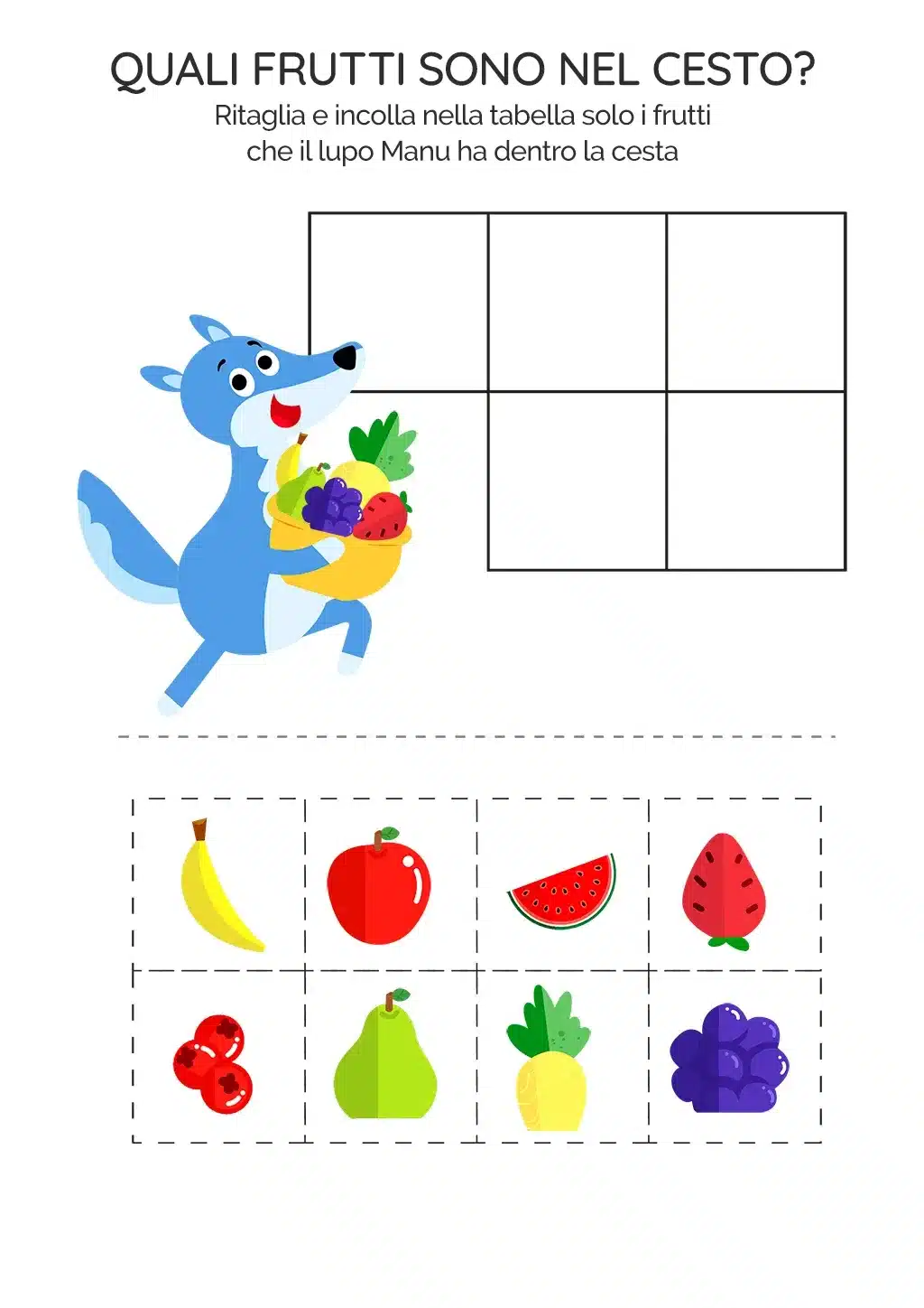 Nella parte superiore della scheda, troverai una griglia con 5 caselle vuote. Accanto alla griglia, c'è Manu il lupo con una cesta di frutta contenente una banana, una pera, una fragola, un ananas e un grappolo di uva. In basso, ci sono gli oggetti da ritagliare, tra cui una banana, una mela, una fetta di anguria, una fragola, 3 ribes, una pera, un ananas e un grappolo di uva.