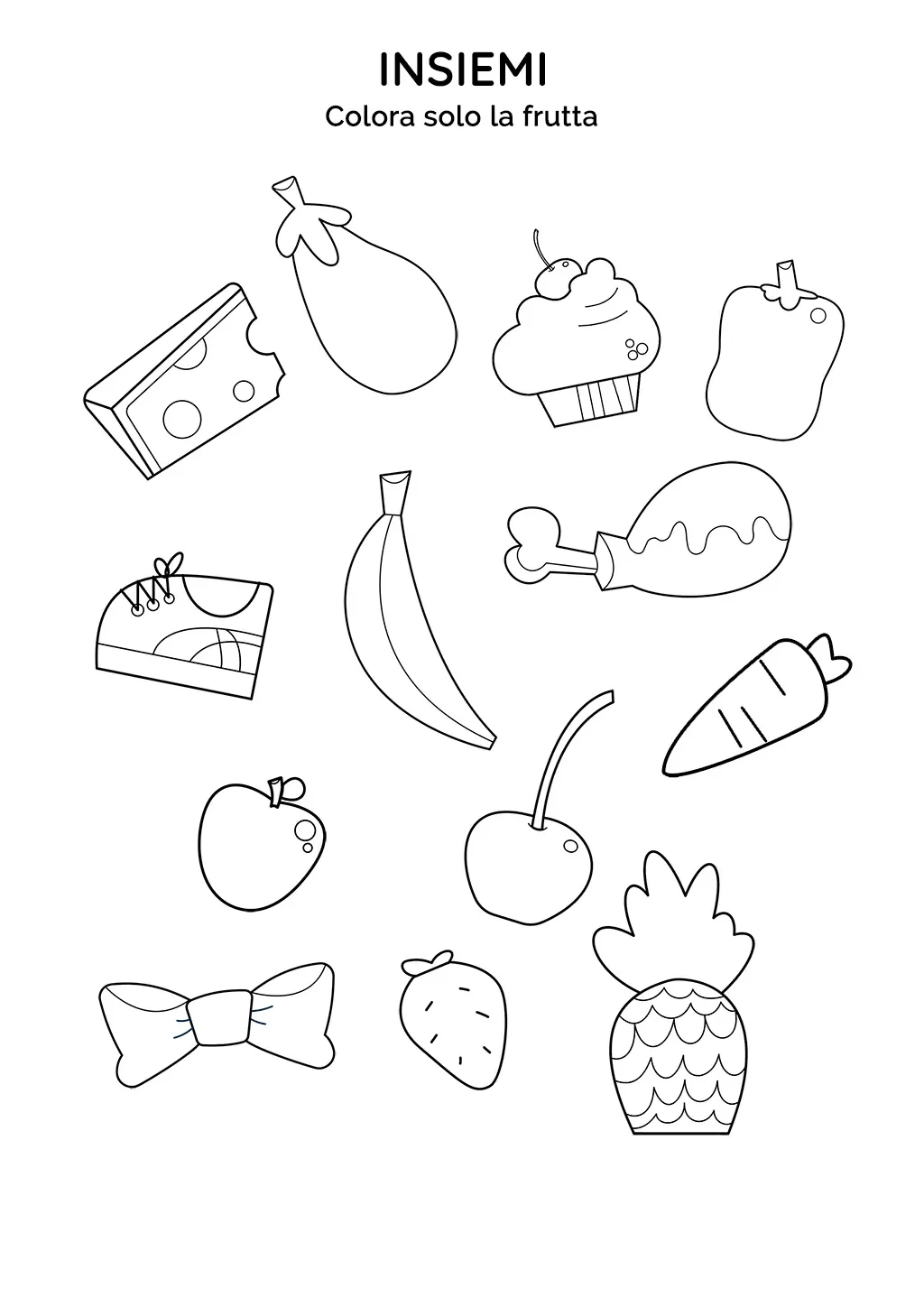 I protagonisti di questa attività sono i bambini stessi, che si divertiranno a esplorare il concetto di insiemi e a colorare gli oggetti che rappresentano la frutta sulla scheda.