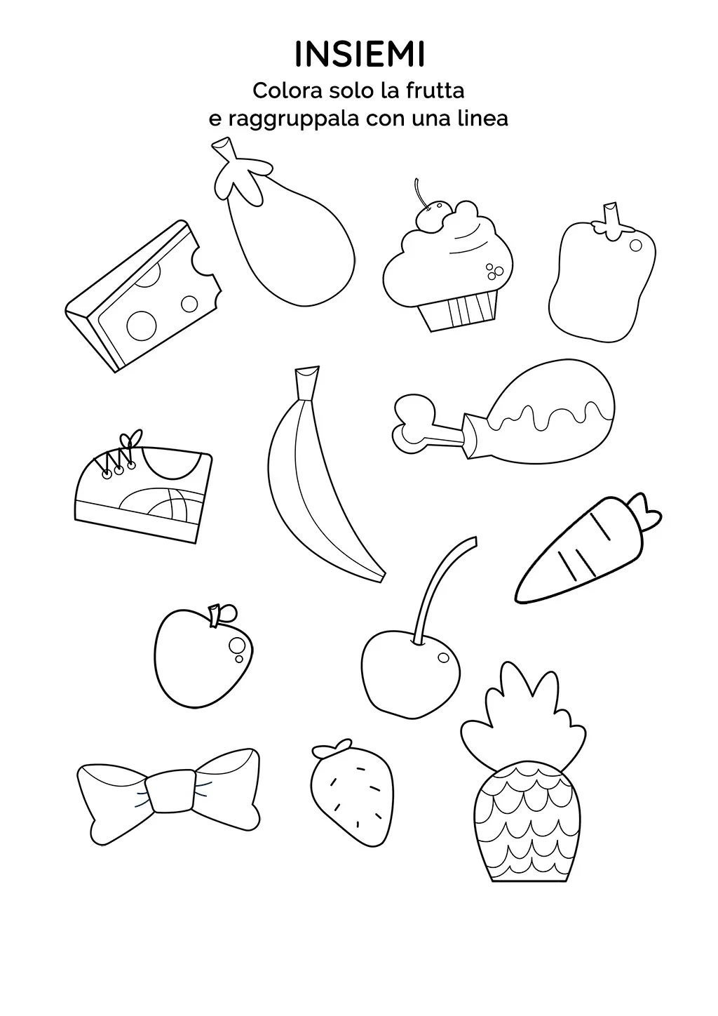I protagonisti di questa attività sono i bambini stessi, che si divertiranno a esplorare il concetto di insiemi, a colorare la frutta e a collegare gli oggetti con una linea sulla scheda.