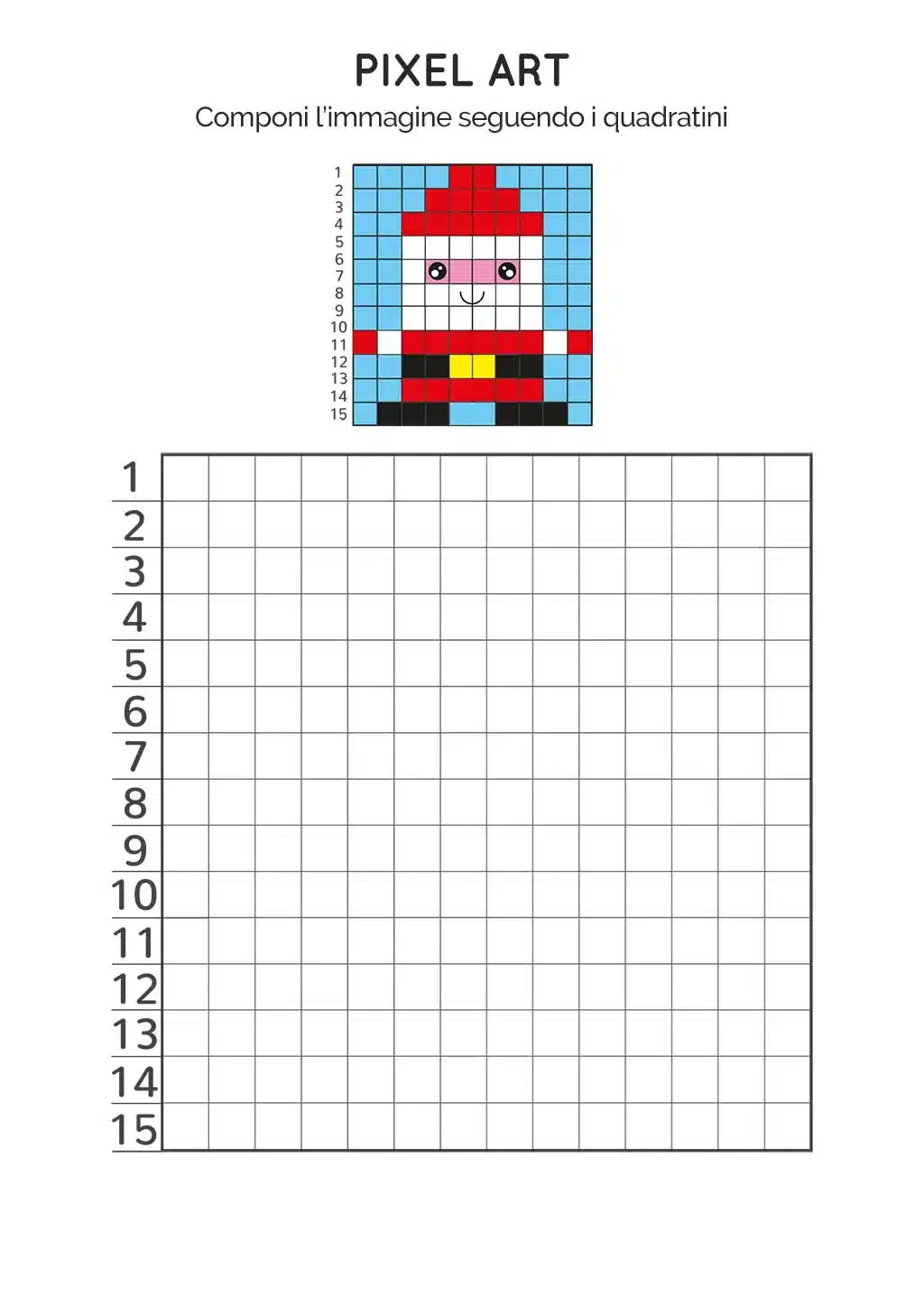 Apprenderai le basi della pixel art creando un'affascinante immagine di Babbo Natale. Segui le istruzioni, colora i quadratini e dà vita al tuo personaggio natalizio!