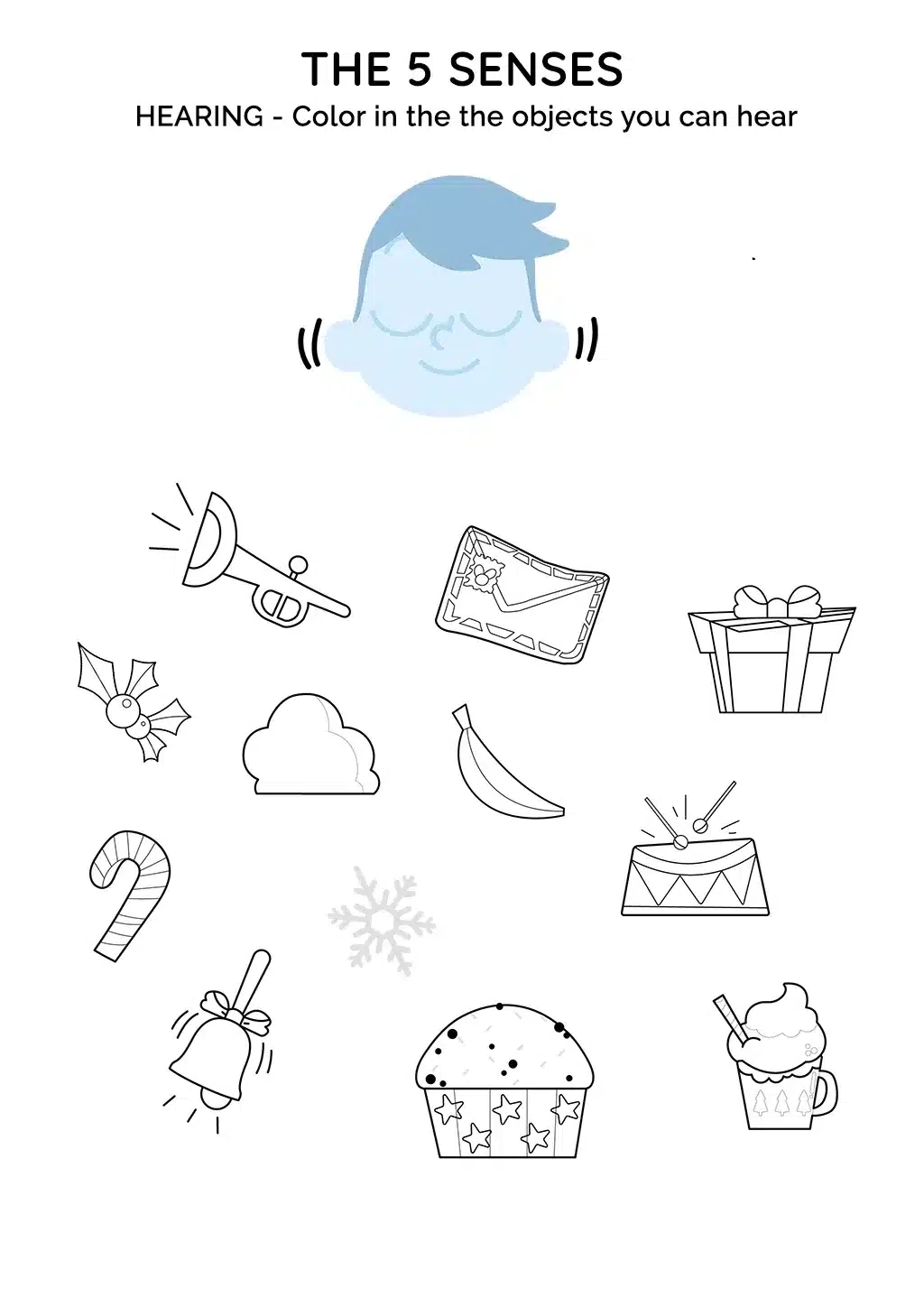 Join a delightful group of characters as they embark on a sonic adventure to explore the sense of hearing. Together, they will discover a trumpet, a letter, a gift package, a cloud, a banana, a drum, holly, a candy cane, a snowflake, a jingle bell, panettone, and a cup.