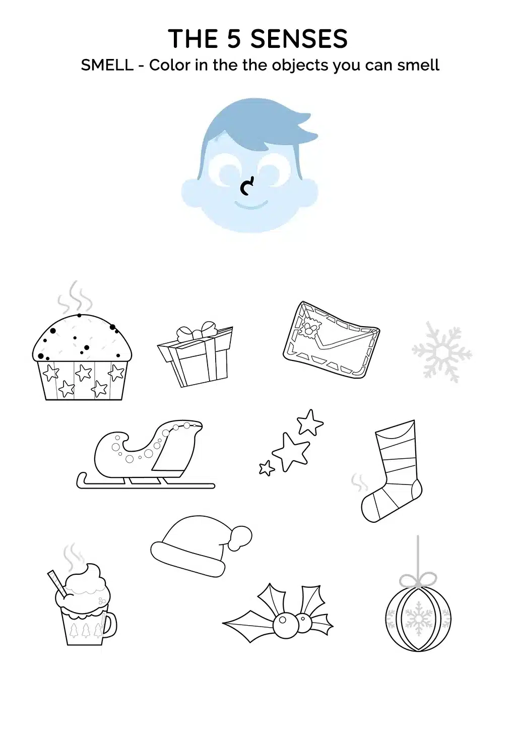 Join a delightful group of characters as they embark on a sensory adventure to explore the sense of smell. Together, they will discover freshly baked panettone, a gift package, a letter, a snowflake, a sleigh, stars, a stinky sock, Santa's hat, a cup of hot chocolate, holly, and a Christmas ball.