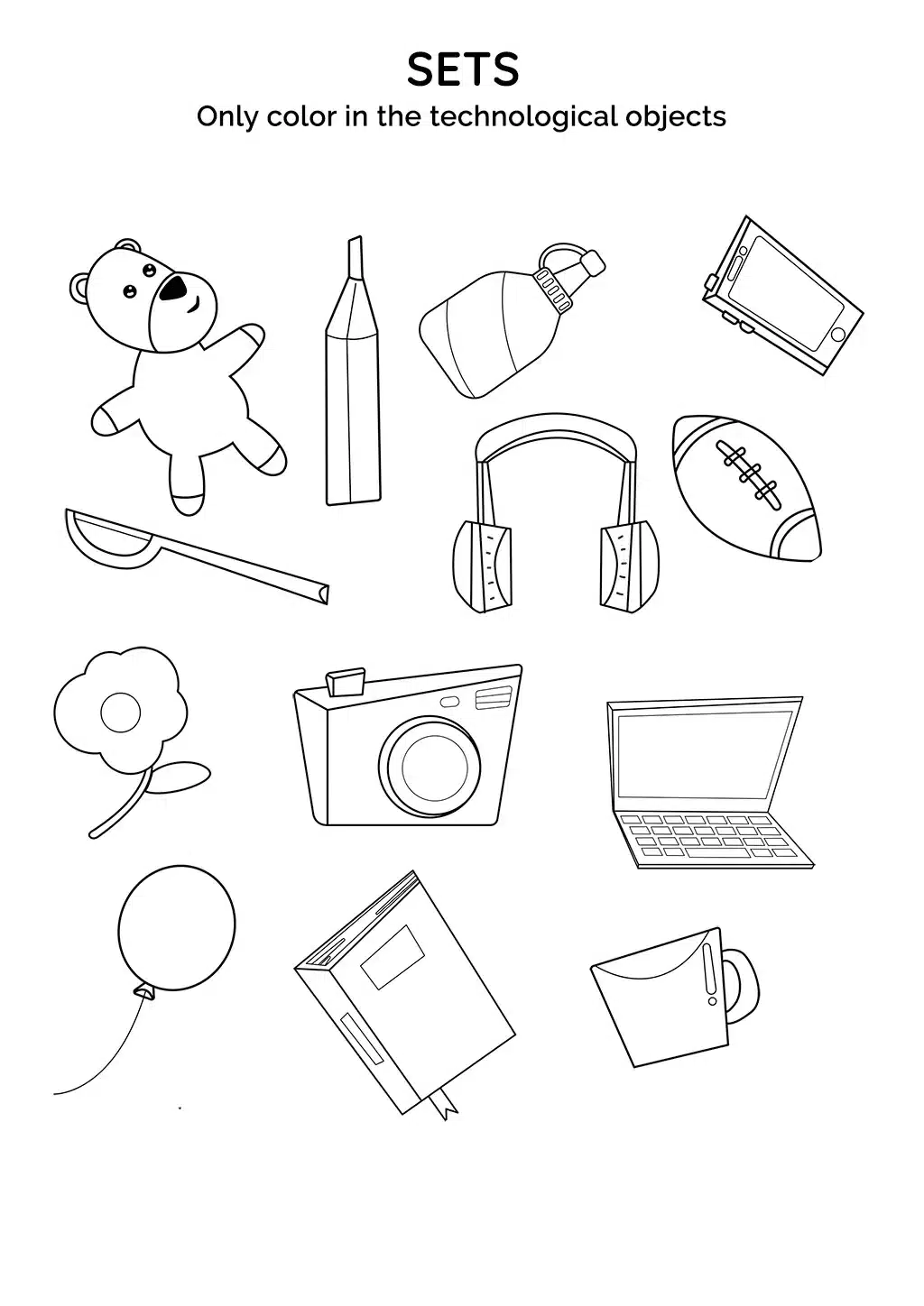 This engaging activity allows kids to identify and color various tech gadgets like smartphones, headphones, cameras, and computers.