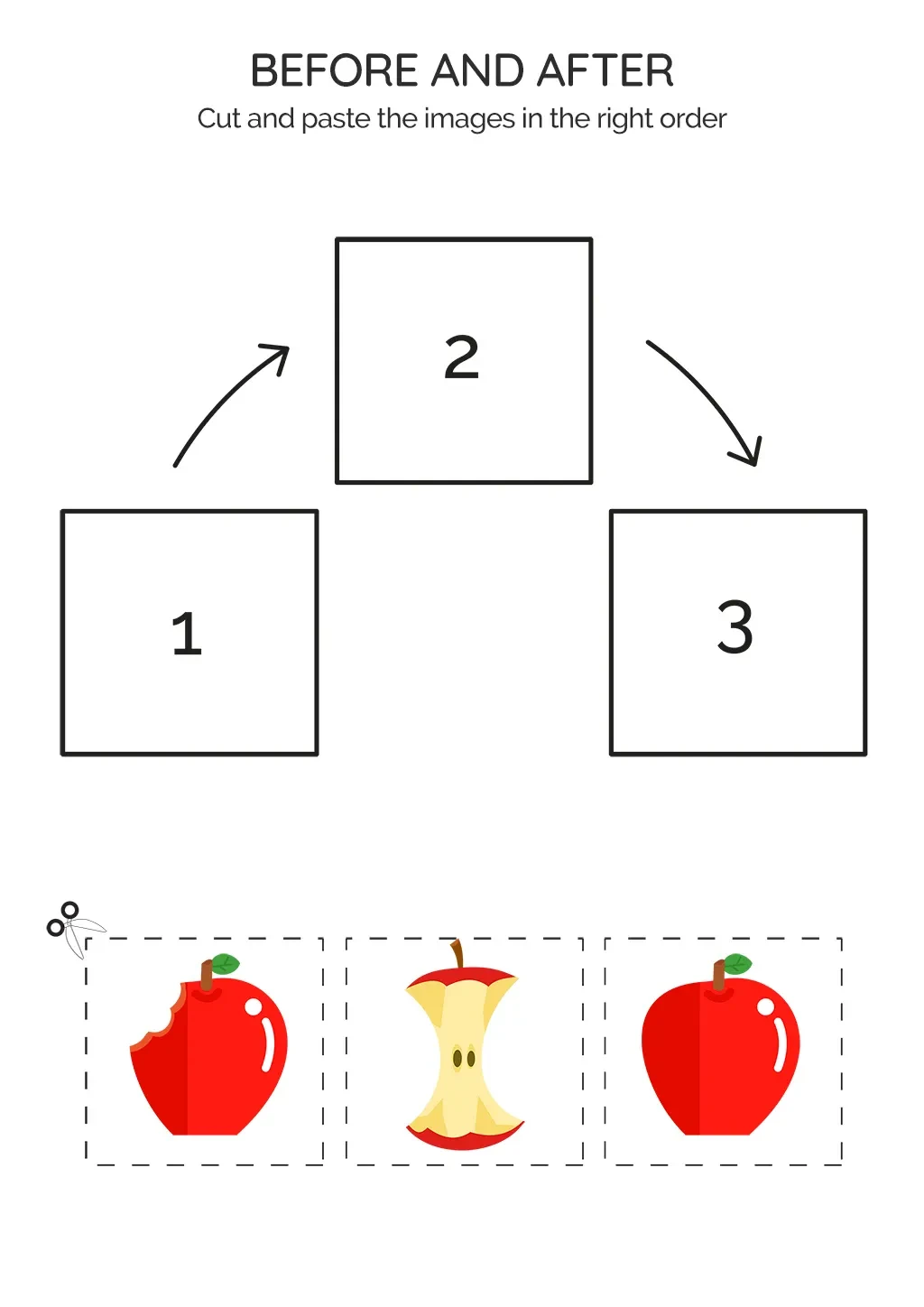 This interactive activity tasks children with cutting out and pasting in order the stages of an apple's lifecycle, from a whole apple to a bitten one, and finally an eaten apple.