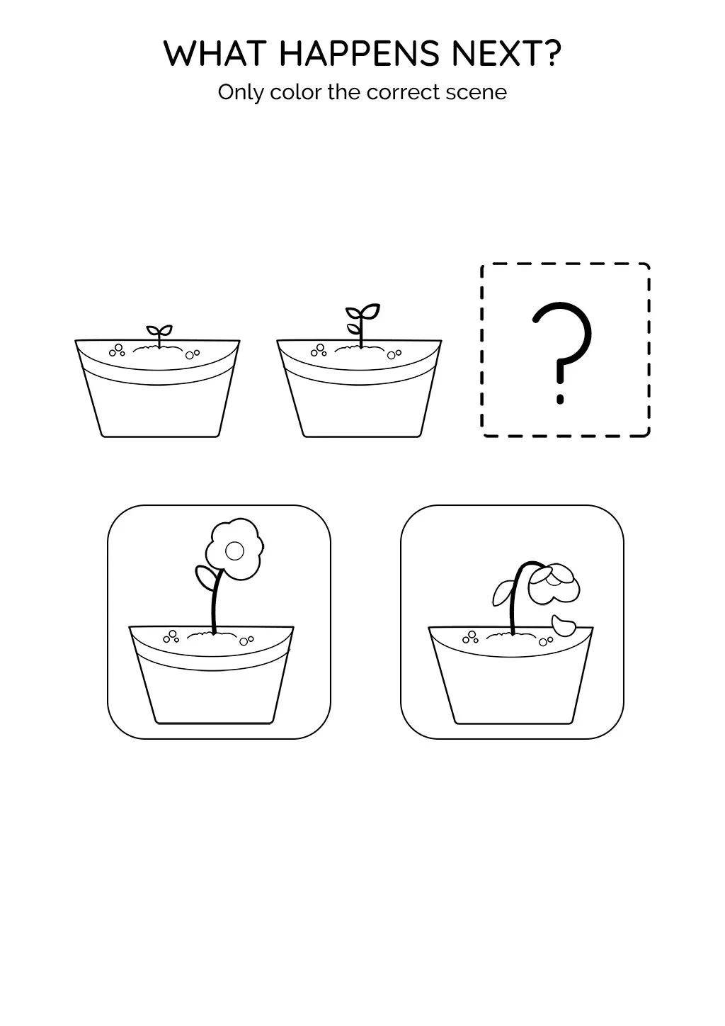 This unique activity challenges children to identify and color the correct next stage of a growing plant, choosing between a healthy, flourishing flower and a wilted one.