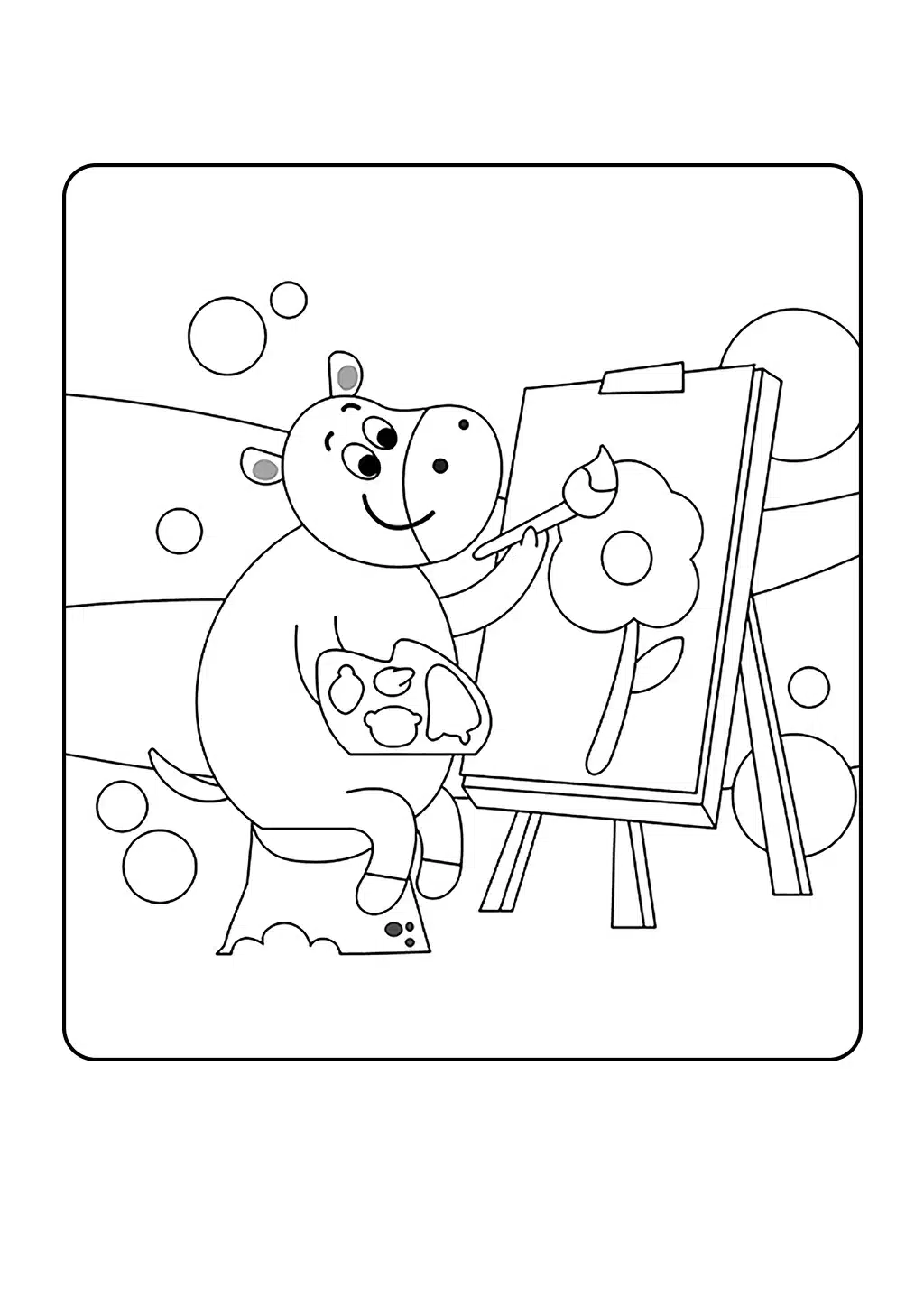 This activity showcases Billy the Hippo, joyfully painting a flower on a canvas. Children can color and explore their own artistic abilities alongside Billy.