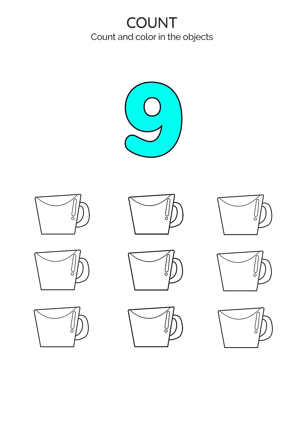This intriguing worksheet helps build counting skills and coloring abilities, focusing on the number '9' and nine cups.