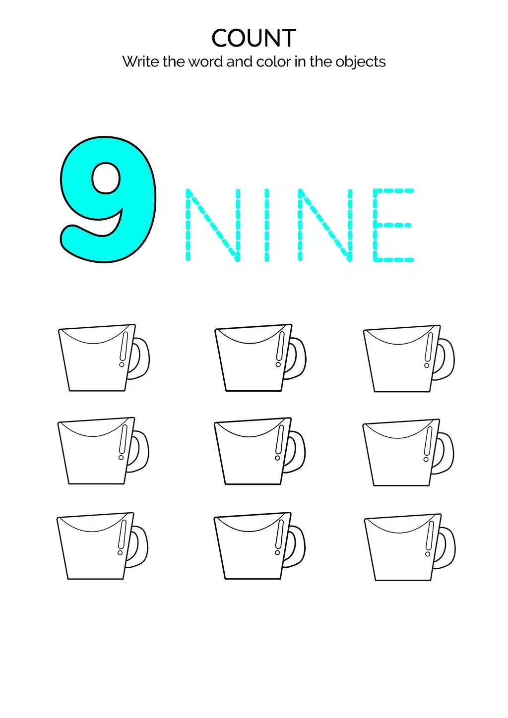 This educational activity invites kids to write the word 'nine' and add color to nine captivating cups, providing a fun way to learn numeracy.
