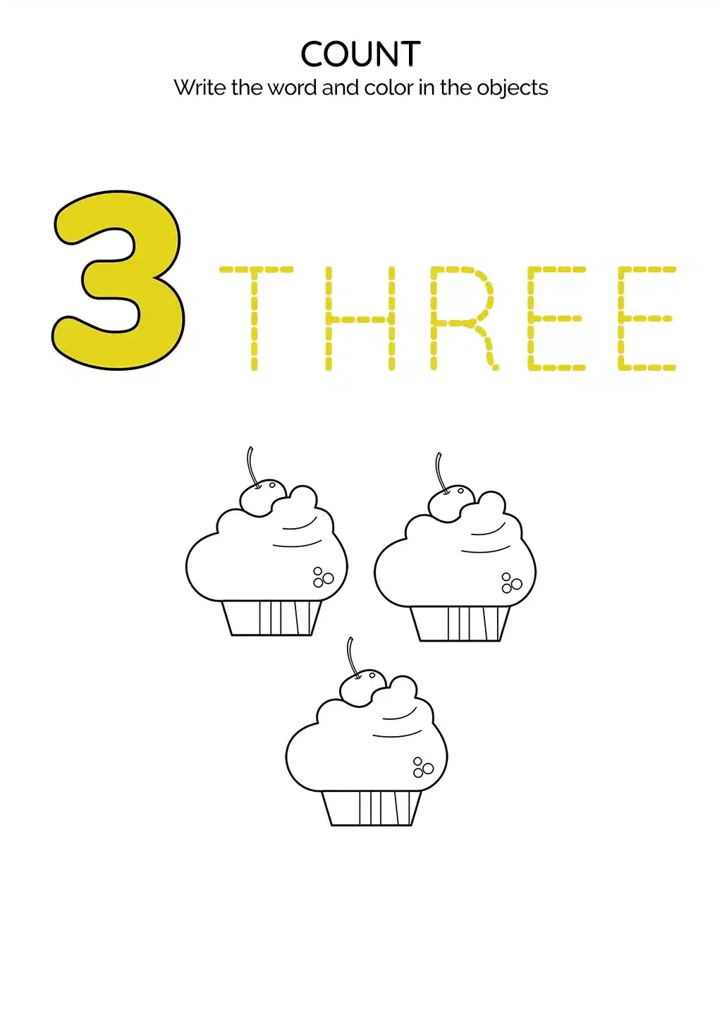 Learning Made Fun: Write 'Three' and Color Delicious Cupcakes with Our Counting Worksheet!