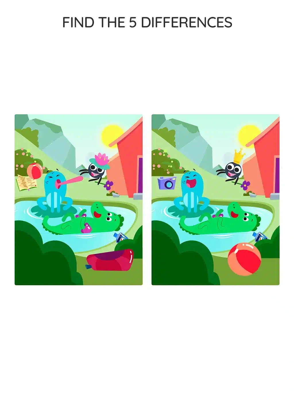 Embark on a fun adventure with Freddy the crocodile as he floats in the pond and has a great time with Mosquita and the frog. Your task is to find the differences and missing objects in the second image.