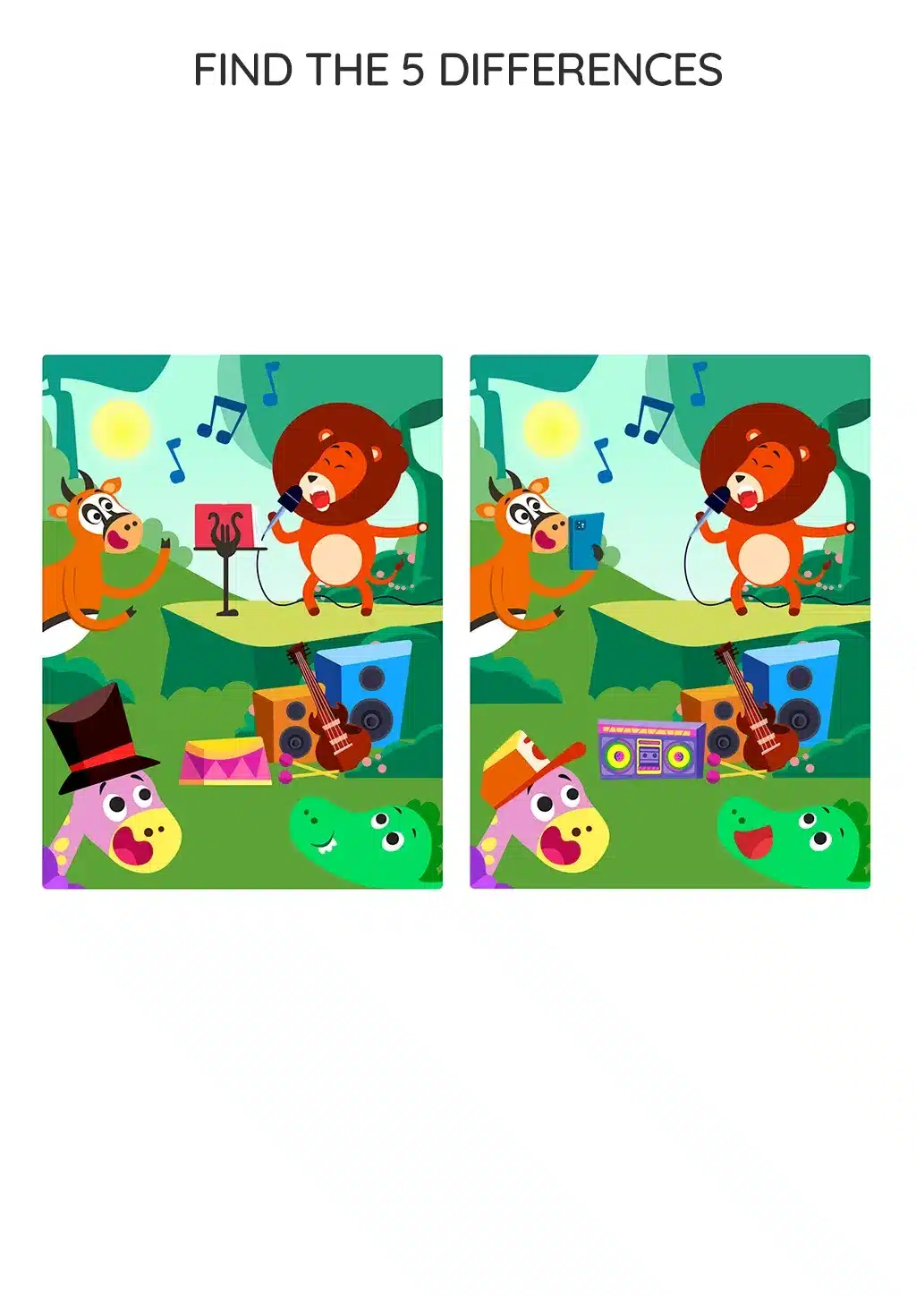 Embark on an exciting adventure with Zaldo the lion and his animal friends as they gather around a stage, where Zaldo sings with a microphone. Your task is to find the differences and missing objects in the second image.