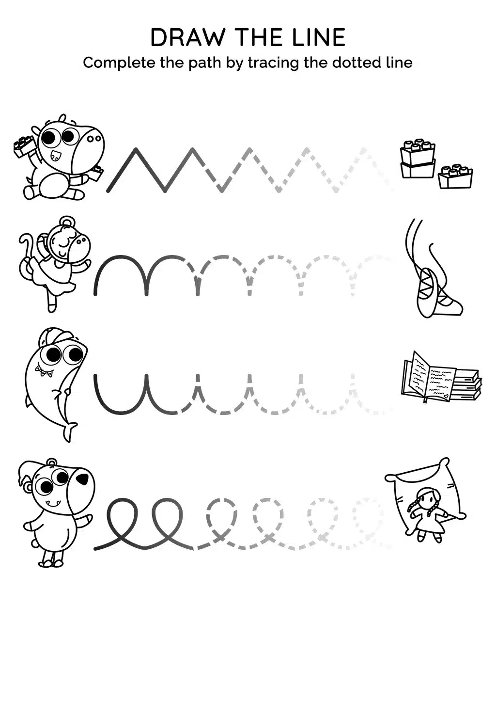 This engaging activity assists your child in improving their fine motor skills by tracing along the dotted path. This exercise lays a strong foundation for future writing as it enhances hand-eye coordination, pencil grip, and control.