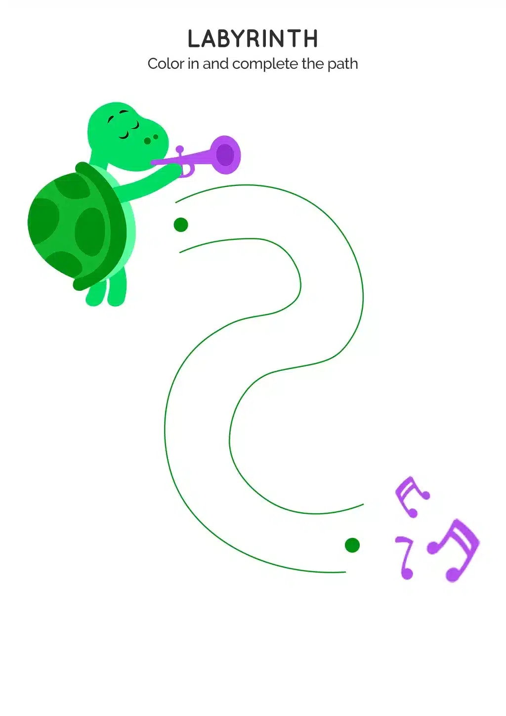 Color the squares and guide the turtle as it follows the wavy path to reach the musical notes.