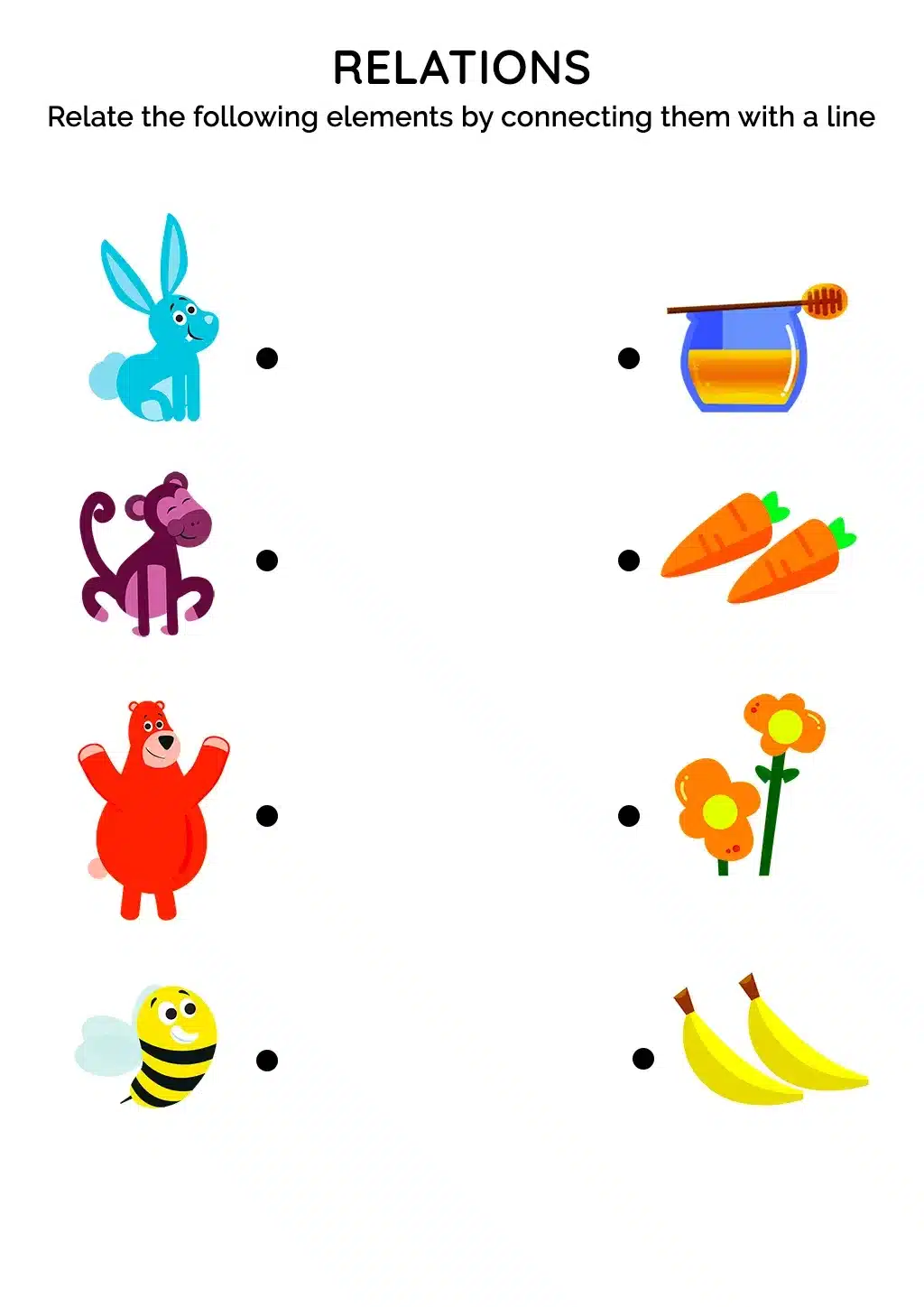 This exciting activity invites children to draw lines connecting animals with their favorite foods. Kids can link a rabbit, monkey, bear, and bee to honey, carrots, flowers, and bananas.