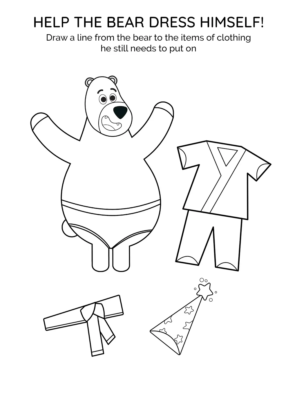 In this playful activity, children get to help Andrew the Bear get dressed for his party. The challenge is to connect Andrew, who is in his underwear, with a suit, a belt, and a party hat that he needs to put on.