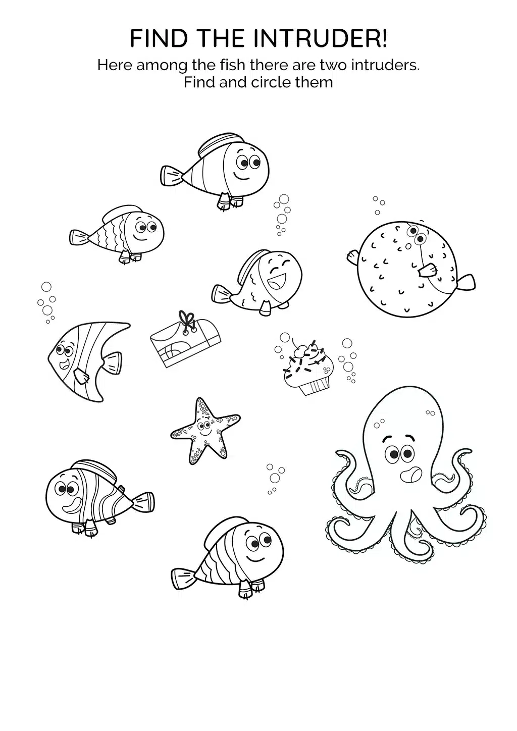 This activity sheet is full of marine life. It features seven fish, a starfish, an octopus, but wait, there are also a cupcake and a shoe! It's up to the kids to spot and circle the two intruders.