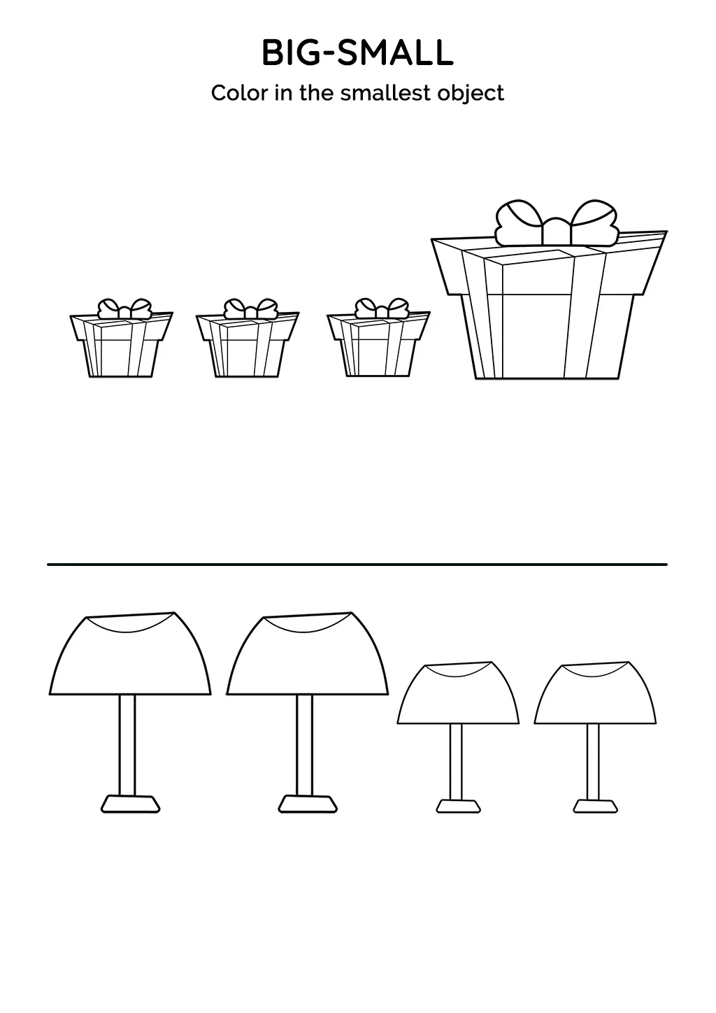Engage your child with this interactive worksheet that focuses on identifying and coloring the smallest object. They will have fun comparing sizes and coloring the smallest object among four gift boxes, consisting of three small ones and one larger, as well as four lamps, including four large ones and two slightly smaller ones.