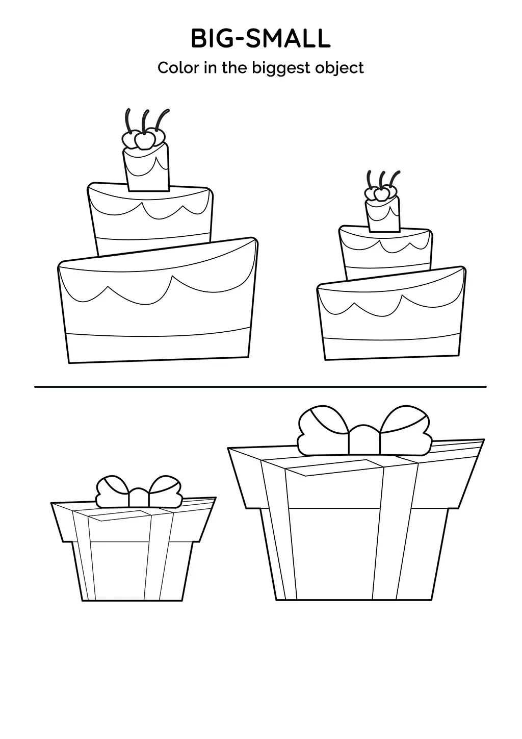 In this worksheet, children take on the challenge of identifying and coloring the largest object from a set of cakes and gift boxes, enhancing their observation and comparison skills.