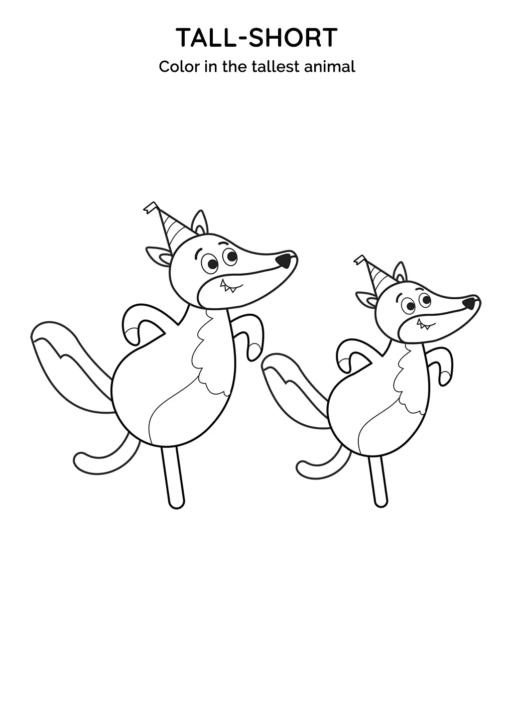 Engage your child with this interactive worksheet that focuses on identifying and coloring the tallest animal. They will have fun comparing heights and coloring the tallest animal among two wolves wearing party hats, one taller and one shorter.