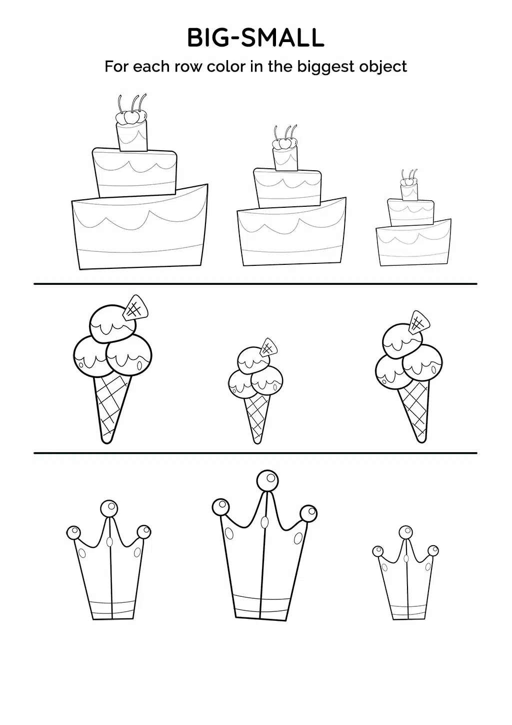 Engage your child with this interactive worksheet that focuses on comparing sizes. They will have fun coloring the bigger objects in each row, featuring cakes, ice cream cones, and crowns of different sizes.