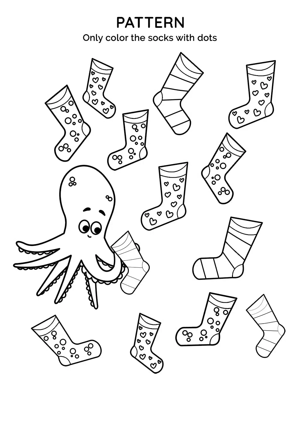 This activity promotes pattern recognition, attention to detail, and fine motor skills. Children will also engage their creativity while coloring the polka dot socks.