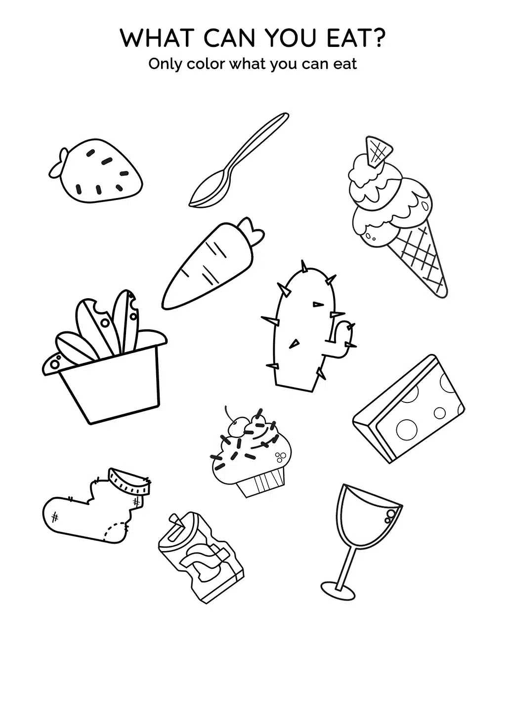 Engage your child with this interactive worksheet that focuses on identifying edible items. They will have fun coloring only the objects that can be eaten.